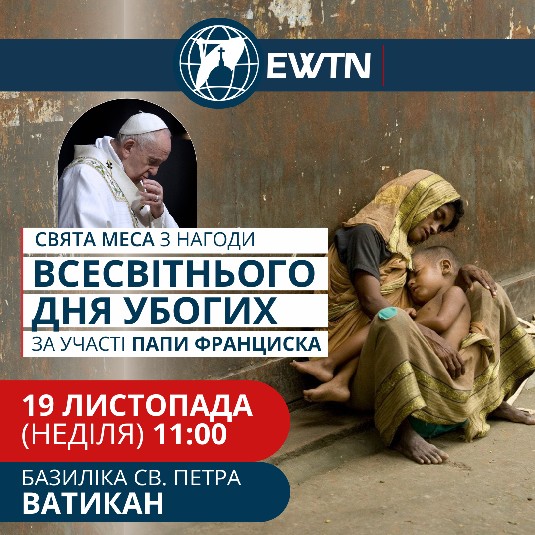 У неділю 19 листопада об 11:00 католицьке Телебачення Віковічного Слова EWTN транслюватиме Святу Месу з нагоди Всесвітнього Дня Вбогих, яку звершить Папа Франциск в базилиці св. Петра у Ватикані.