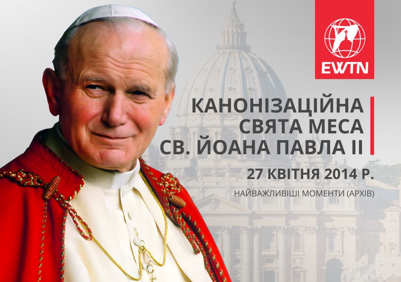 З цієї нагоди запрошуємо Вас переглянути наш архівний матеріал — запис фрагментів трансляції канонізаційної Святої Меси, під час якої Папа Франциск 27 квітня 2014 року проголосив Йоана Павла ІІ та Йоана ХХІІІ святими. Ця подія стала великим знаком єдності Церкви та вдячності Богові за дар святого Папи, який усе своє життя віддав служінню Христові та людині.
