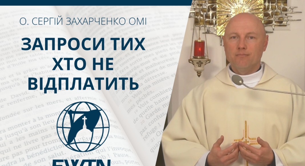 Того часу Ісус говорив до одного начальника фарисеїв, який запросив Його: «Коли ти справляєш обід або вечерю, не запрошуй своїх друзів, ані своїх братів, ані своїх родичів, ані багатих сусі дів, щоб і вони тебе колись запросили, – і в цьому буде тобі винагорода. Але коли влаштовуєш бенкет, клич убогих, калік, кривих, сліпих, – і будеш блаженний, бо не мають чим тобі віддати; віддасться ж тобі у воскресінні праведних».